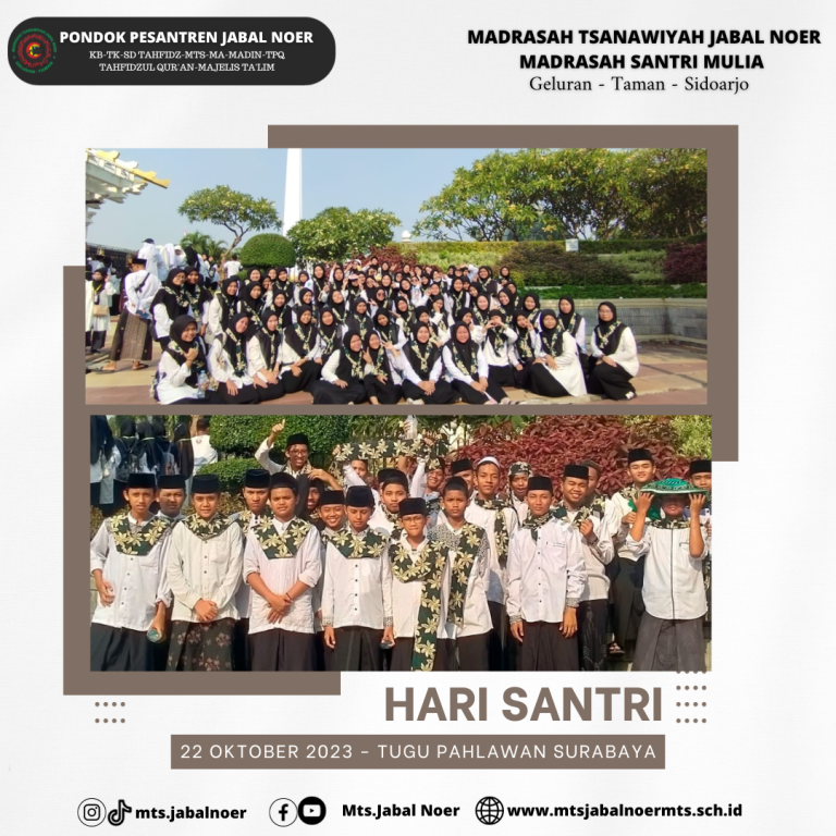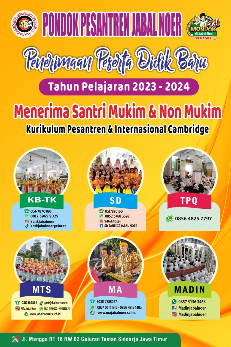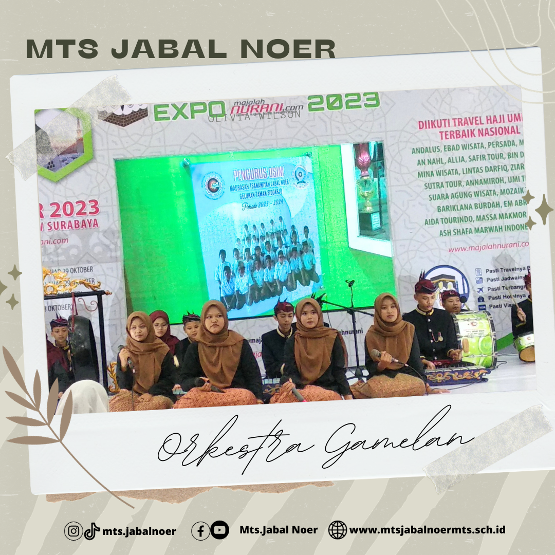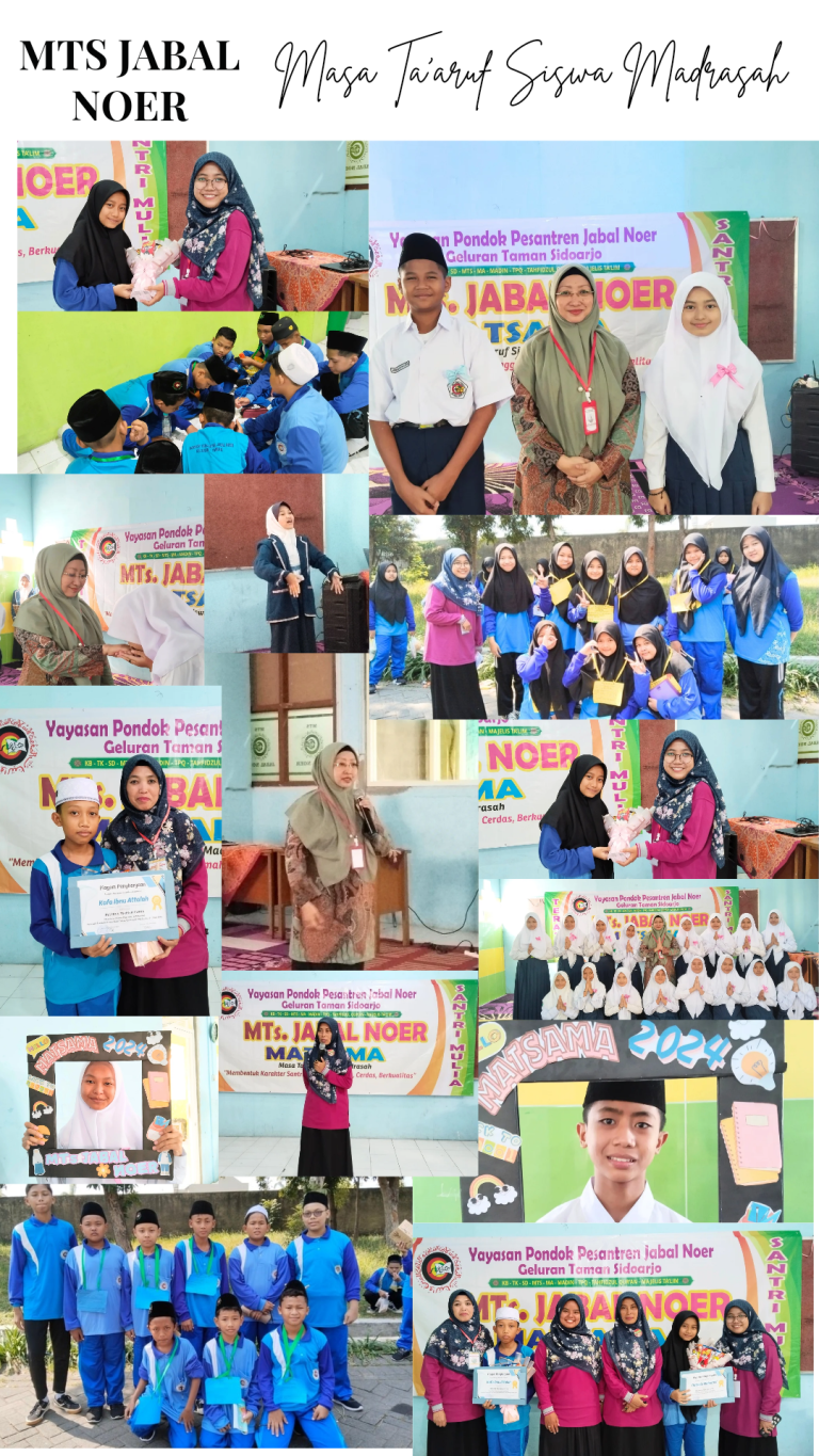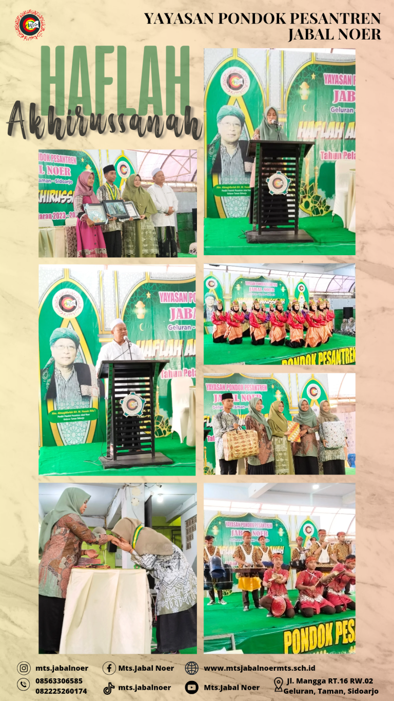 Juli 8, 2023 HAFLAH AKHIRUSSANAH MTs. JABAL NOER Acara Haflah Akhirussanah dimeriahkan oleh beberapa penampilan dari santriwan santriwati seperti tari saman, drumband, orchestra, paduan suara, patrol dan masih banyak lagi.