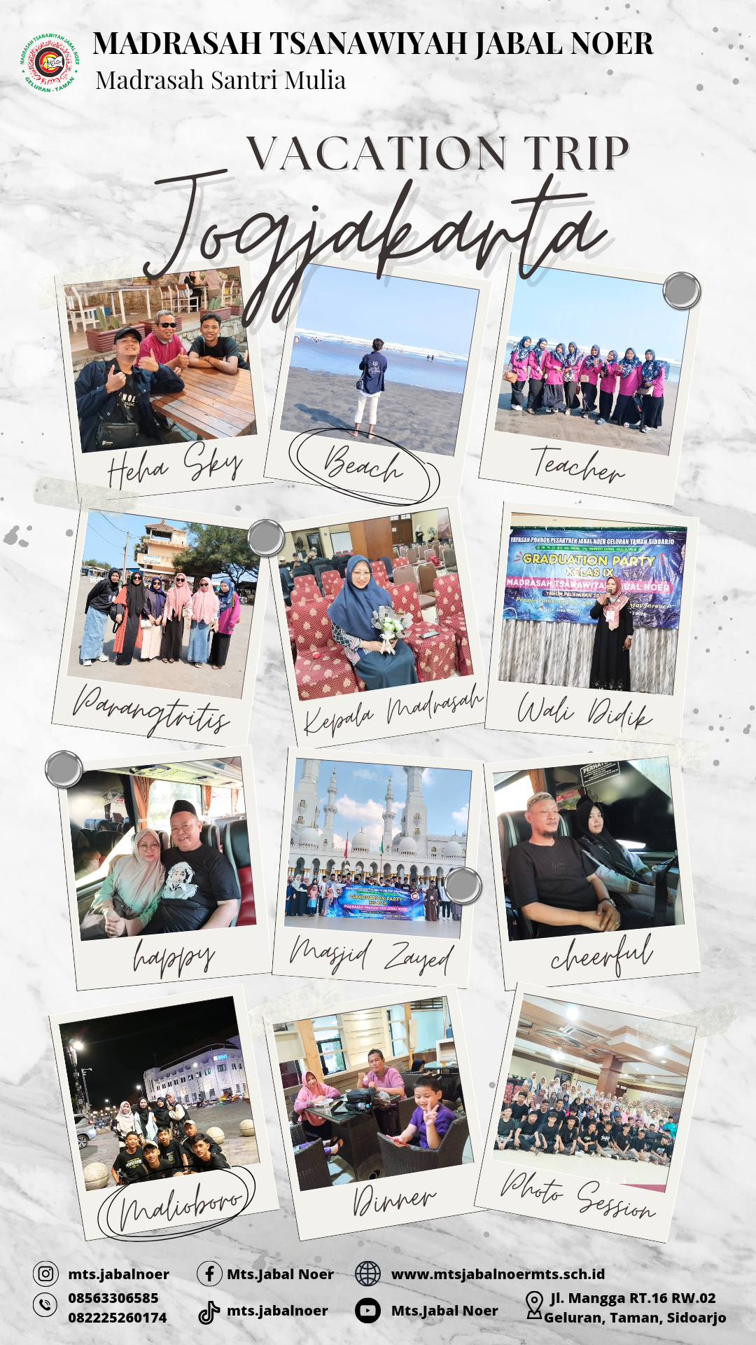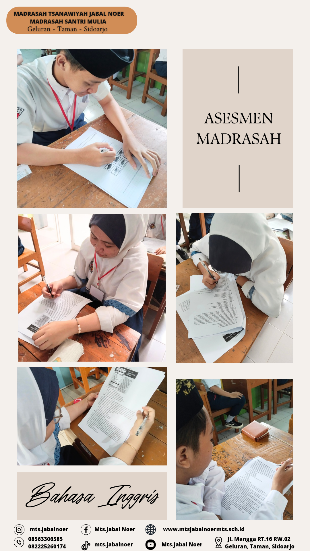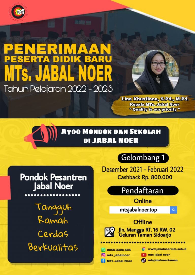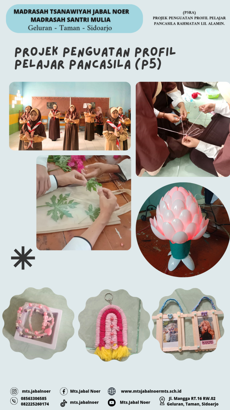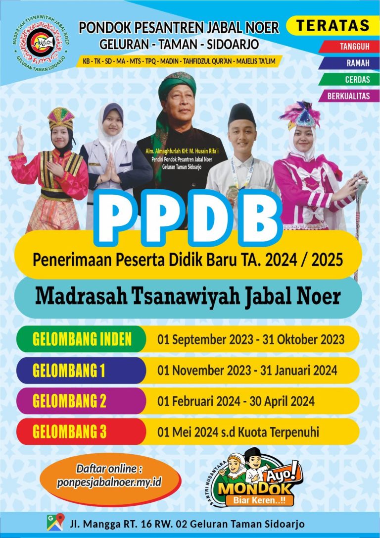 Juli 8, 2023 HAFLAH AKHIRUSSANAH MTs. JABAL NOER Acara Haflah Akhirussanah dimeriahkan oleh beberapa penampilan dari santriwan santriwati seperti tari saman, drumband, orchestra, paduan suara, patrol dan masih banyak lagi.